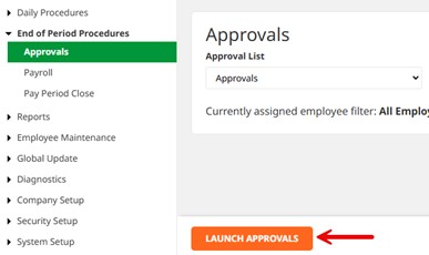 The Approvals page is used to approve timesheets at the end of a pay period. It provides one place for reviewing timesheet hours for many or all employees at once.