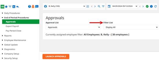 - Ensure all employees have checkmarks in the checkboxes by all employee names. You can use the Filter List drop-down at the top to get the list of only unapproved employees. You may also sort the screen by Supervisor or Pay Group.