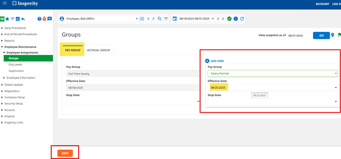 1. Change employee Pay Group to “Salary Exempt” or “Hourly” (whichever is applicable). Reminder: The Effective Date is always the first day of a pay period. Click SAVE.