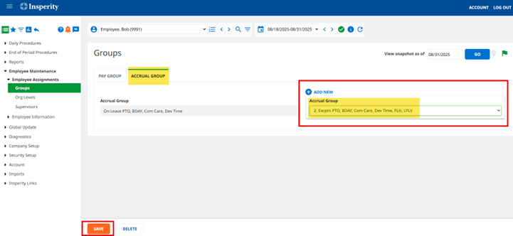 1. Go back to the Accrual Group Assignment tab. Change employee Accrual Group to the new Accrual Group. Accruals will start calculating in that pay period. Click SAVE.