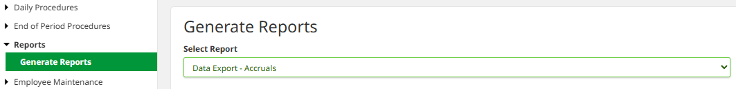 The Accruals report will export accrual information by employee for the specified date range. This report will provide the following types of information; employee, worked organization level, accrual name, effective date, transaction type, and hours.